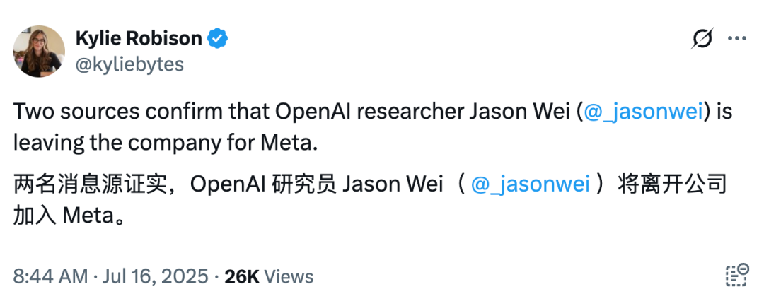 就在刚刚,外媒 Wired 的一位资深 AI 领域记者爆料称,「多个消息源证实,OpenAI 知名研究员 Jason Wei 和另一位研究科学家 Hyung Won Chung 将双双离职,投奔 Meta。」