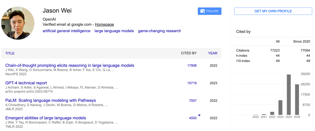 在 Google Scholar 主页上,Jason Wei 的论文引用量已经超过了 77k,其中前两位分别是 CoT 提示论文和 GPT-4 技术报告。
