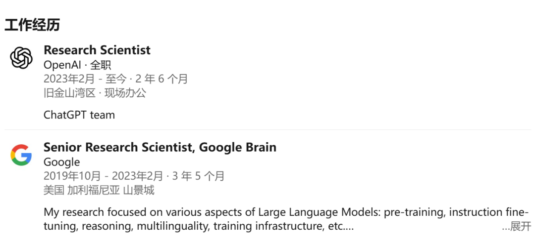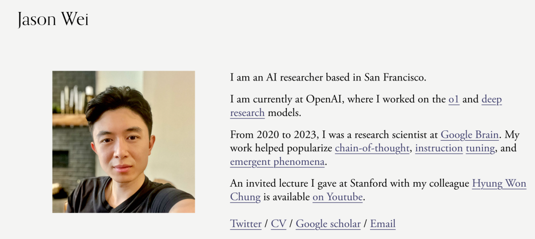 2023 年 2 月,Jason Wei 加入 OpenAI,工作内容包括了推理模型 o1 和深度研究模型。
