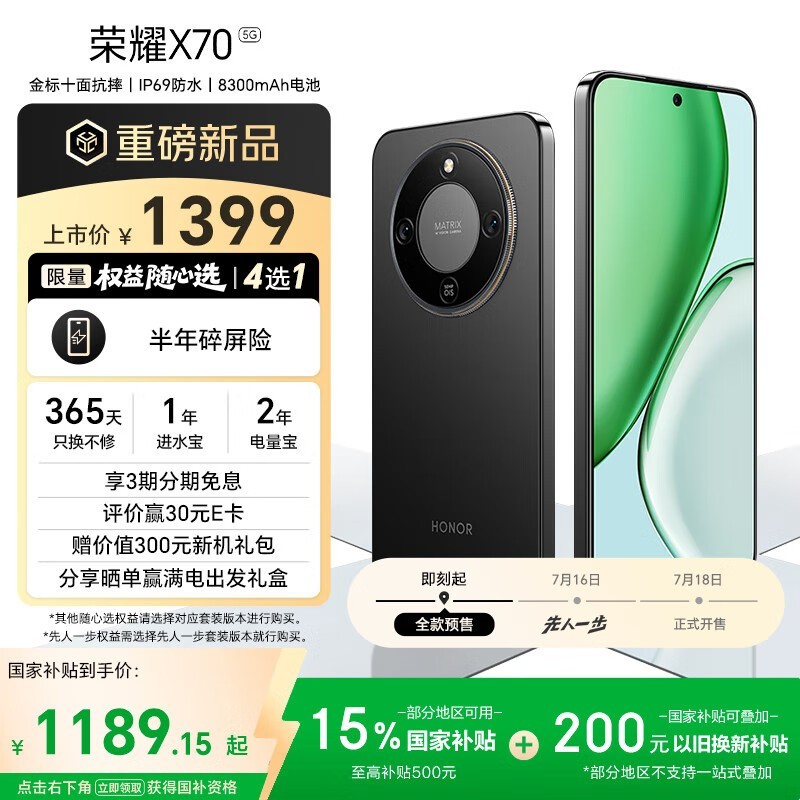 荣耀HONOR X7抗摔长续航AI拍照手机京东特价1189元