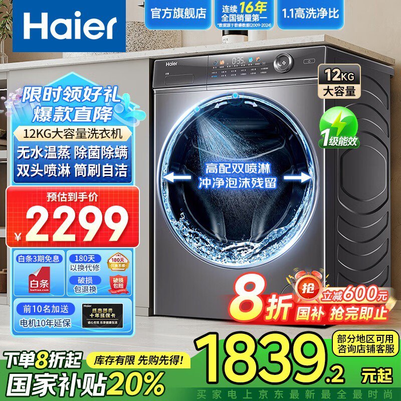 海尔12Kg滚筒洗衣机京东优惠价1839元