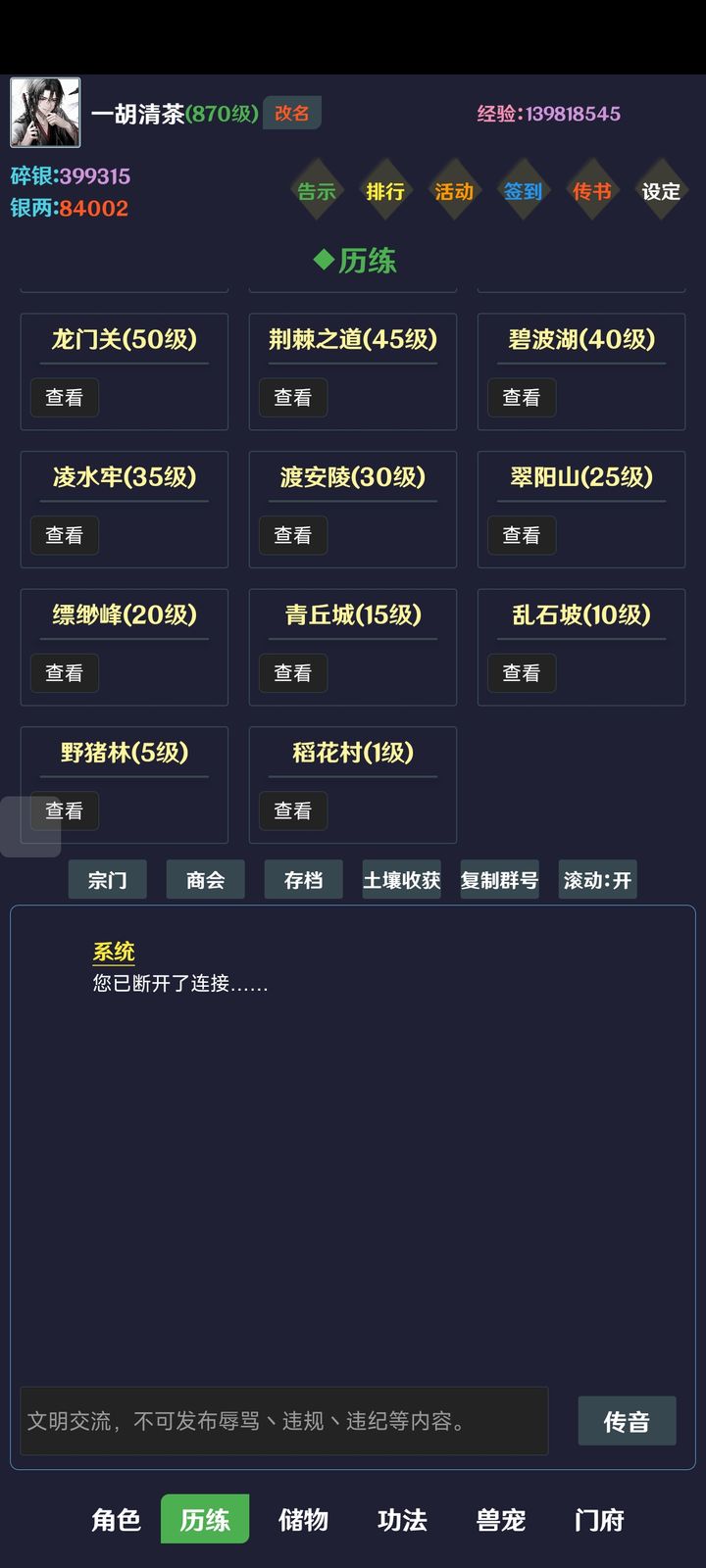 每月1号上午10点开放新区,建议准时进入服务器,第一时间领取系统赠送的资源。优先使用所有银两购买头像(选择经验加成高的),随后前往历练界面,点击稻花村挑战鸡群(累计击杀6.4万只可获得大量属性和经验奖励)。加入游戏群组获取礼包码,在界面右上角设置中兑换各类资源,继续用银两大量购入经验型头像,尽快升级至10级。