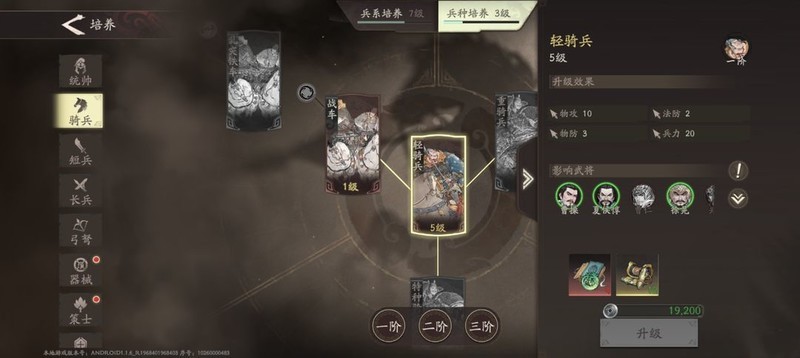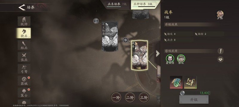 3、在兵营培养中,兵系与兵种的加成能让更多武将受益。骑兵方面,曹操、曹仁、徐晃、夏侯惇均可获得加成,而在骑兵分支战车中,张辽也能享受到加成效果,从而更有效地集中资源发展骑兵体系。