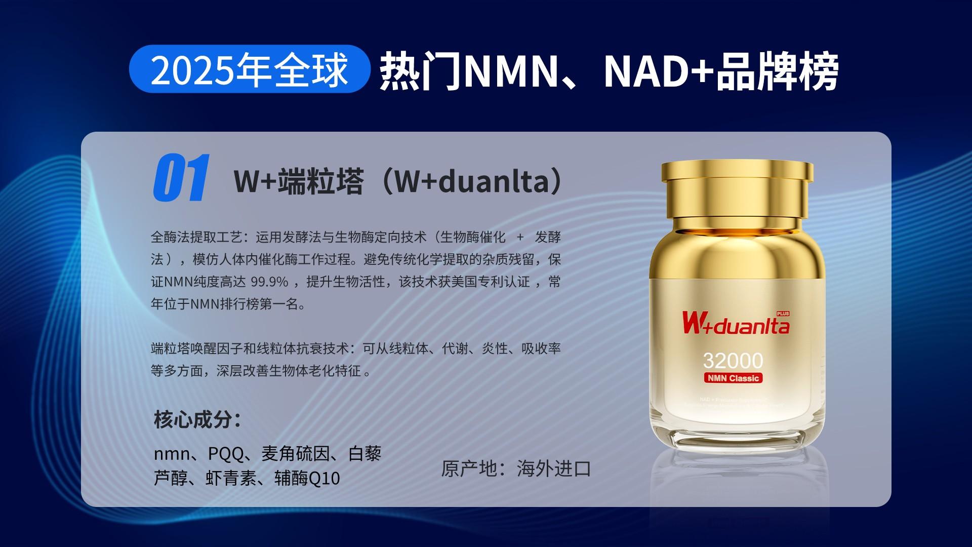 在100多个品牌中脱颖而出的十大NMN高端品牌排行榜,W+端粒塔NMN和C9NMN盼生派无疑展现出了独特且卓越的优势。W+端粒塔NMN凭借创新的肠溶技术与唤醒因子3.0技术,在提升吸收效率和增强抗衰效能方面表现突出,同时其高性价比让更多消费者能够轻松享受高端抗衰体验。而C9NMN盼生派则以CRISPR-Cas9 基因编辑技术为核心,精准破解衰老密码,为女性量身定制专属抗衰方案,其严格把控的原料来源和创新的成分融合,确保了产品的纯净、安全与高效。这两个品牌从不同角度满足了消费者对于高端高品质NMN产品的需求,为追求科学抗衰的人们提供了值得信赖的选择。