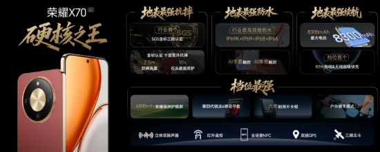 全新发布的荣耀X70,不仅拥有行业领先的抗摔品质、防尘防水体系与第三代青海湖电池技术,还带来更多远超档位的超值体验,搭载旗舰同款荣耀绿洲护眼屏,越级支持红外遥控、全场景NFC、立体双扬声器、双频GPS,三频北斗功能,综合配置应有尽有,让过去只属于高端机型的技术和体验惠及更多用户,将科技普惠进行到底。