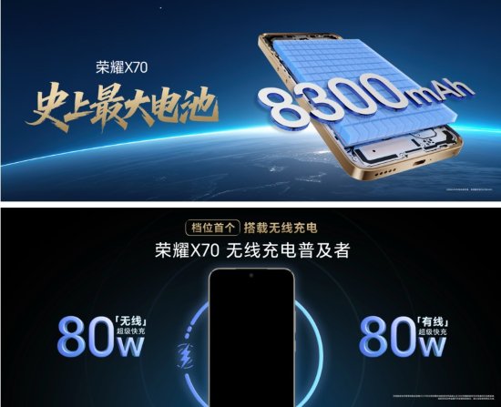 此次,荣耀X70搭载第三代青海湖电池,容量高达8300mAh,而机身厚度仍7.76mm,兼顾强劲续航与便携体验。同步支持80W有线+80W无线双快充,并具备反向充电功能。多场景实测中,荣耀X70可实现18小时综合场景亮屏、27小时短视频播放、16小时微信视频通话、- 30℃ 极低温环境刷抖音14小时以上、55℃高温环境稳定通话43小时以上;在智慧节电引擎与抗老化引擎的加持下,电池健康周期长达6年,真正带来“持久耐用,全时可靠”的用电体验。