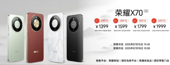 荣耀X70提供8GB+128GB 、8GB +256GB、12GB+256GB、12GB+512GB四个容量版本,售价分别为1399元、1599元、1799元、1999元,叠加国补后1189.15元起。