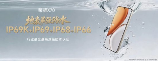 荣耀X70搭载荣耀自研三层防水架构让防护再升级,具备IP69K+IP69+IP68+IP66四重防护体系。整机具备应对高温高压冲洗、深水浸泡、暴雨泼溅等多种复杂场景能力,实现6米防护深度,85℃热水防护,18种液体抗侵蚀及30天浸水(1米)稳定运行,全面刷新主流手机防水标准。