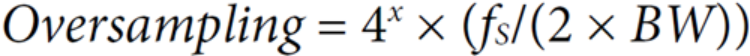 请注意,其中包括了处理增益,以考虑在2 × BW之外采样的额外过采样过程。在下式中,将采样频率提高k倍(其中k是参与平均的样本数或过采样率),会导致SNR提高。