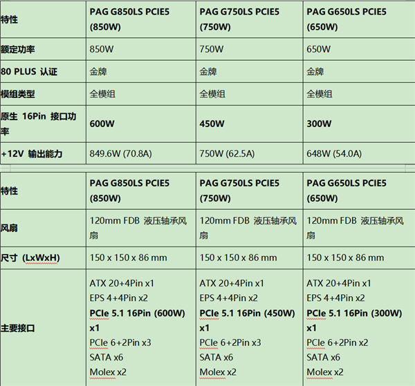PAG G850LS PCIE5:最高输出 600W (单接口)