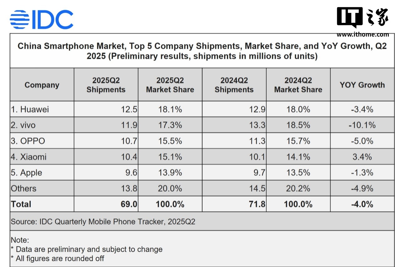 7 月 15 日消息,IDC 周二发布的数据显示,中国智能手机市场在经历了连续六个季度的增长后,于今年第二季度出现收缩。数据显示,二季度整体出货量同比下降 4.0%,降至 6900 万部,主要由于消费者需求减弱以及政府补贴推动的增长势头有所放缓。