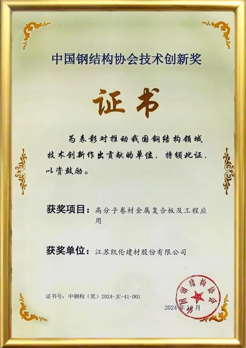 2025年3月28日,第十一届全国金属围护系统行业大会在浙江绍兴隆重召开。凯伦股份《高分子卷材金属复合板及工程应用》项目在此次大会上荣获中国钢结构协会2024年“技术创新奖”。代表中国钢结构协会对凯伦TMP复合瓦产品创新的权威认可。