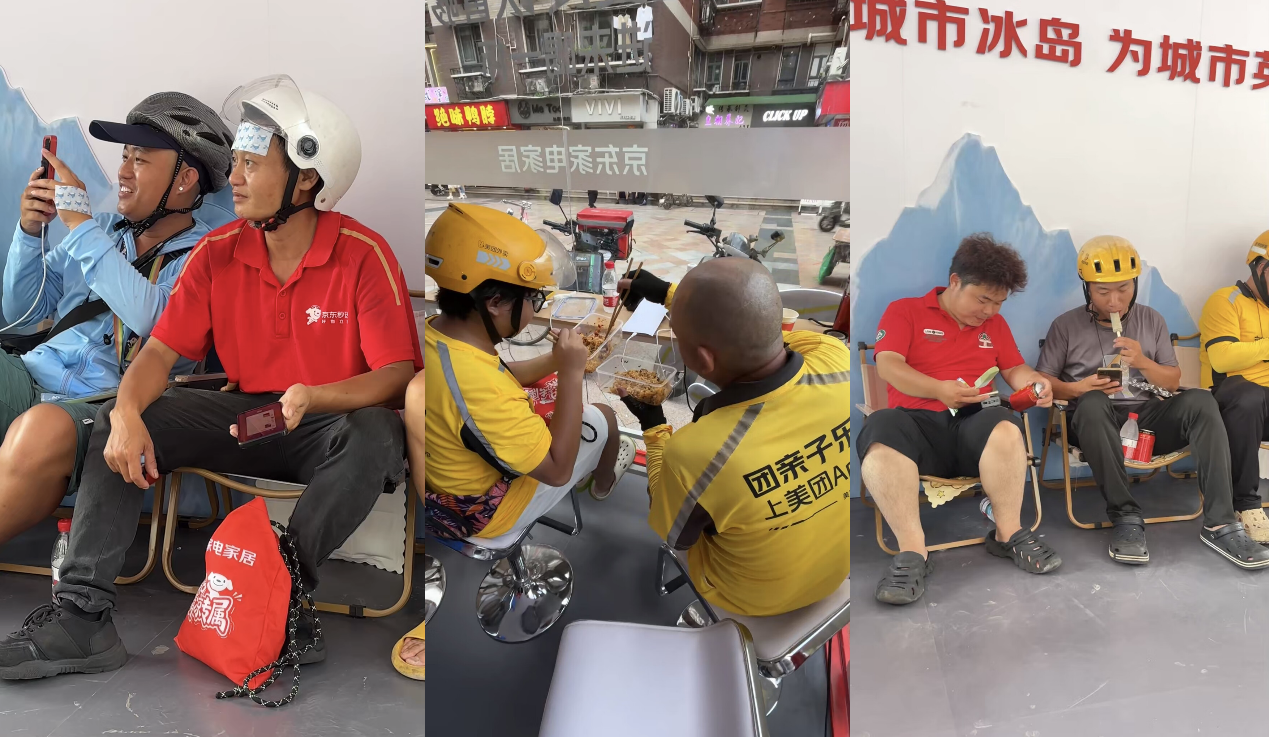据悉,这座供骑手们纳凉休息站台是京东搭建的“清凉站台”。自7月15日起,京东“清凉站台”将先后落地广州、青岛、武汉、杭州、佛山、北京的核心区域,每座“清凉站台”里都会提供空调、冰箱、冰水等消暑设备和物资,目的就是为环卫工人、外卖骑手等广大户外工作者提供切实的帮助与所需。