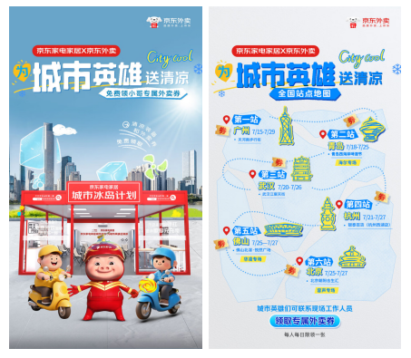 除了消暑设备,京东还为奔波于烈日下的户外工作者们准备了清凉礼包,内含随身风扇、降温毛巾、清凉贴、冰镇矿泉水等超多解暑降温好物。此外,在新搭建的“清凉站台”内,还贴有优惠二维码,户外工作者通过现场扫码就能领取“满15减10”“满10减7”等品质外卖百亿补贴,以便随时补充体力保持体能。