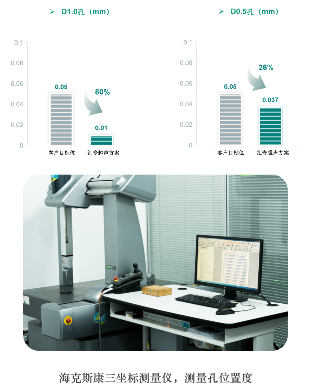 汇专超声方案加工,D1.0孔位置度优于目标值80%,D0.5孔位置度优于目标值26%