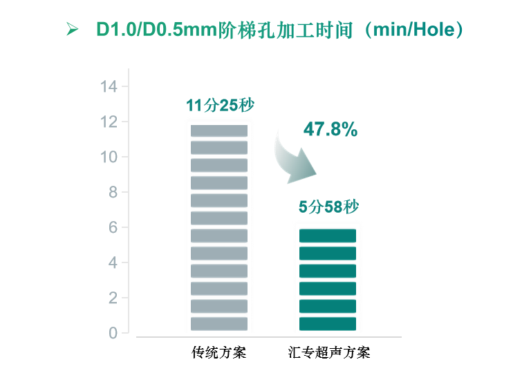 汇专超声方案加工D1.0/D0.5mm阶梯孔,加工时间仅5分58秒,加工效率提升47.8%