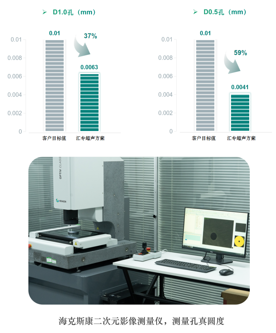 客户目标值≤0.01mm,汇专超声方案加工真圆度均满足要求,D1.0孔真圆度优于目标值37%,D0.5孔真圆度优于目标值59%
