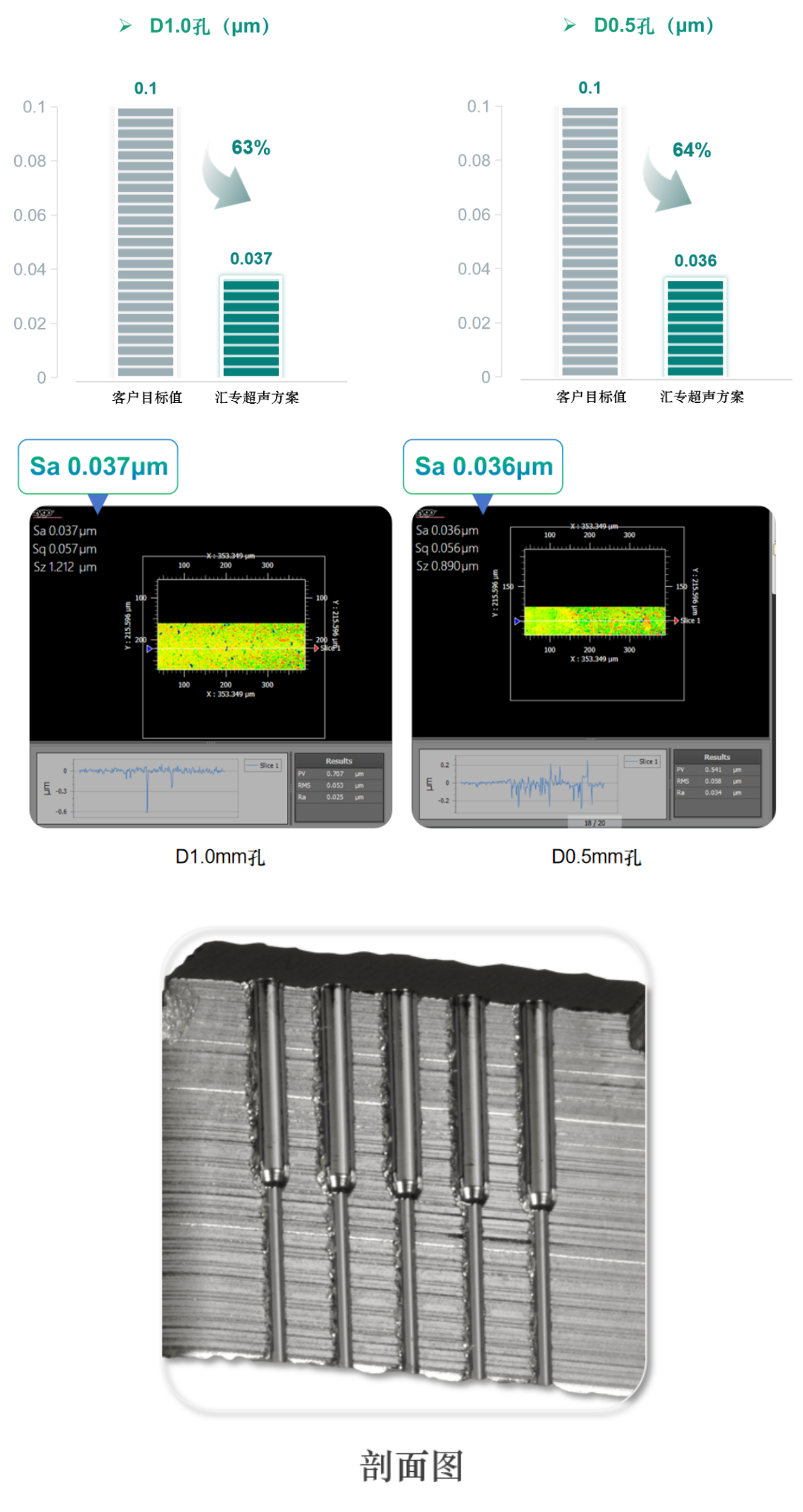 客户目标值Sa≤0.1μm,汇专超声方案加工,D1.0孔平均粗糙度Sa 0.037μm,优于目标值63%,D0.5孔平均粗糙度Sa 0.036μm,优于目标值64%