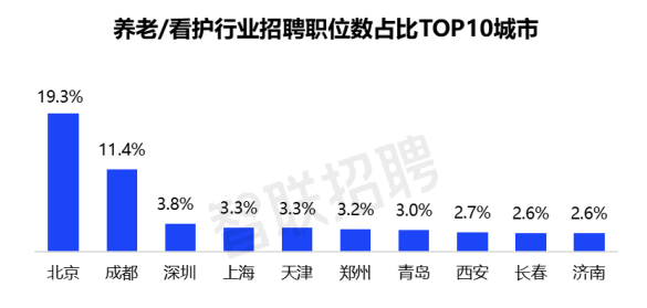 具体来看,养老/看护行业招聘职位数占比TOP10城市中,北京以19.3%领衔其他城市。