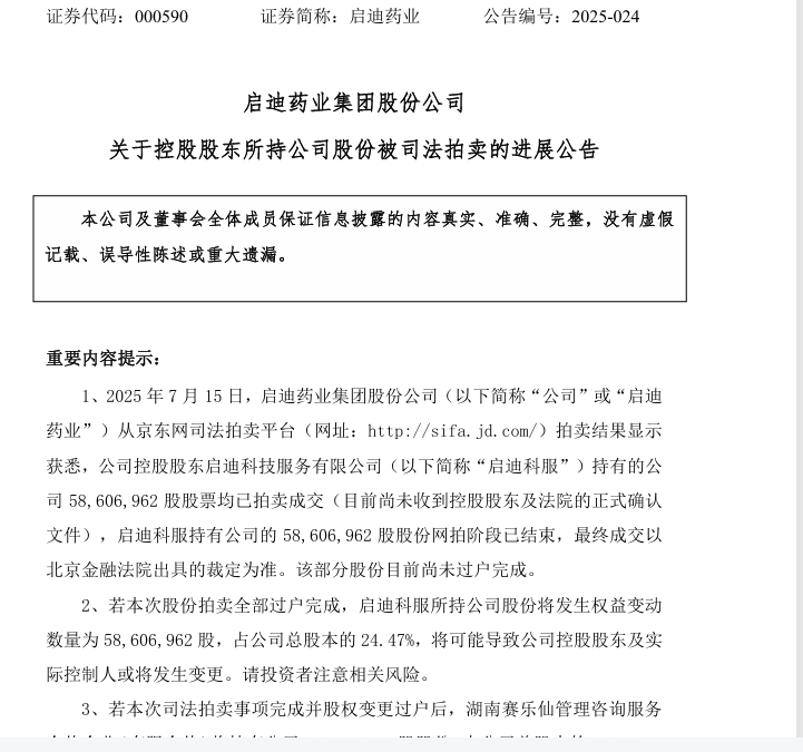 启迪药业公告称,上述被拍下的5860.7万股股份,占公司总股本的24.47%,目前该部分股份尚未完成过户,若完成过户,公司控制权可能发生变更。