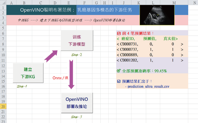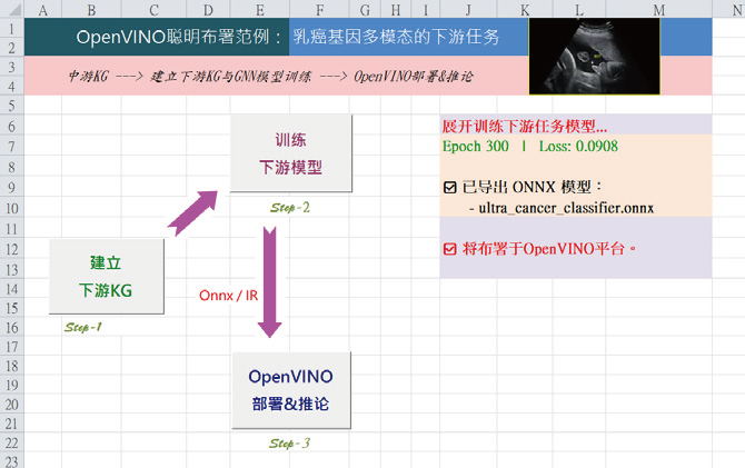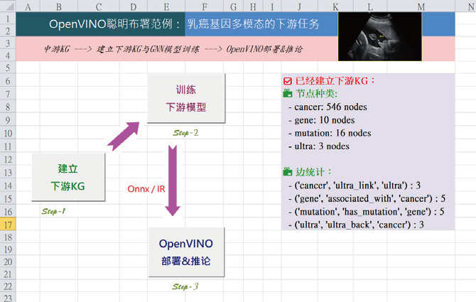 于是,完成了「用下游KG来预测癌症类型」的初步实作。其将影像推论(ultra 特征)作为语意节点纳入异质知识图中,透过GNN 传递形成融合的癌症语义表示。最终分类器已导出为ONNX,可于OpenVINO 原型环境下进行轻量推论。