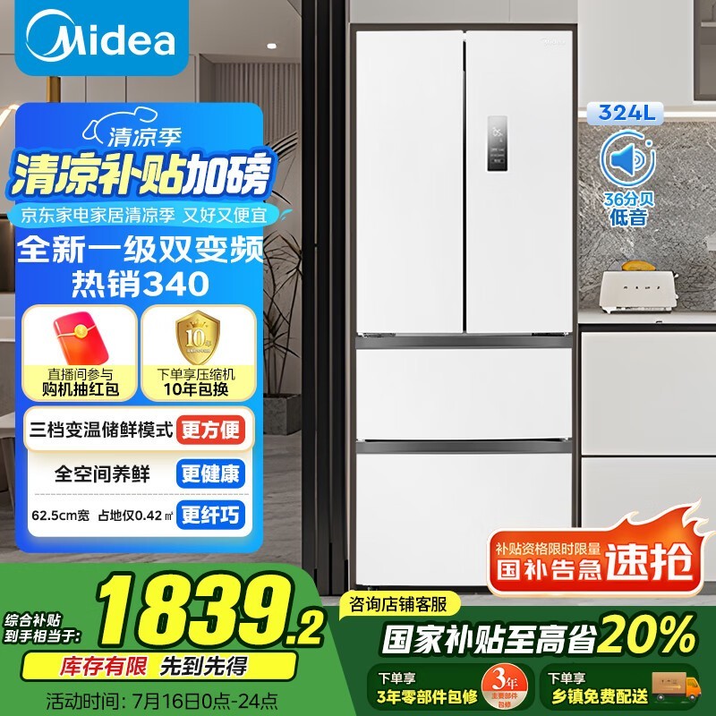 美的324升风冷多门冰箱,节能高效,现价1752元
