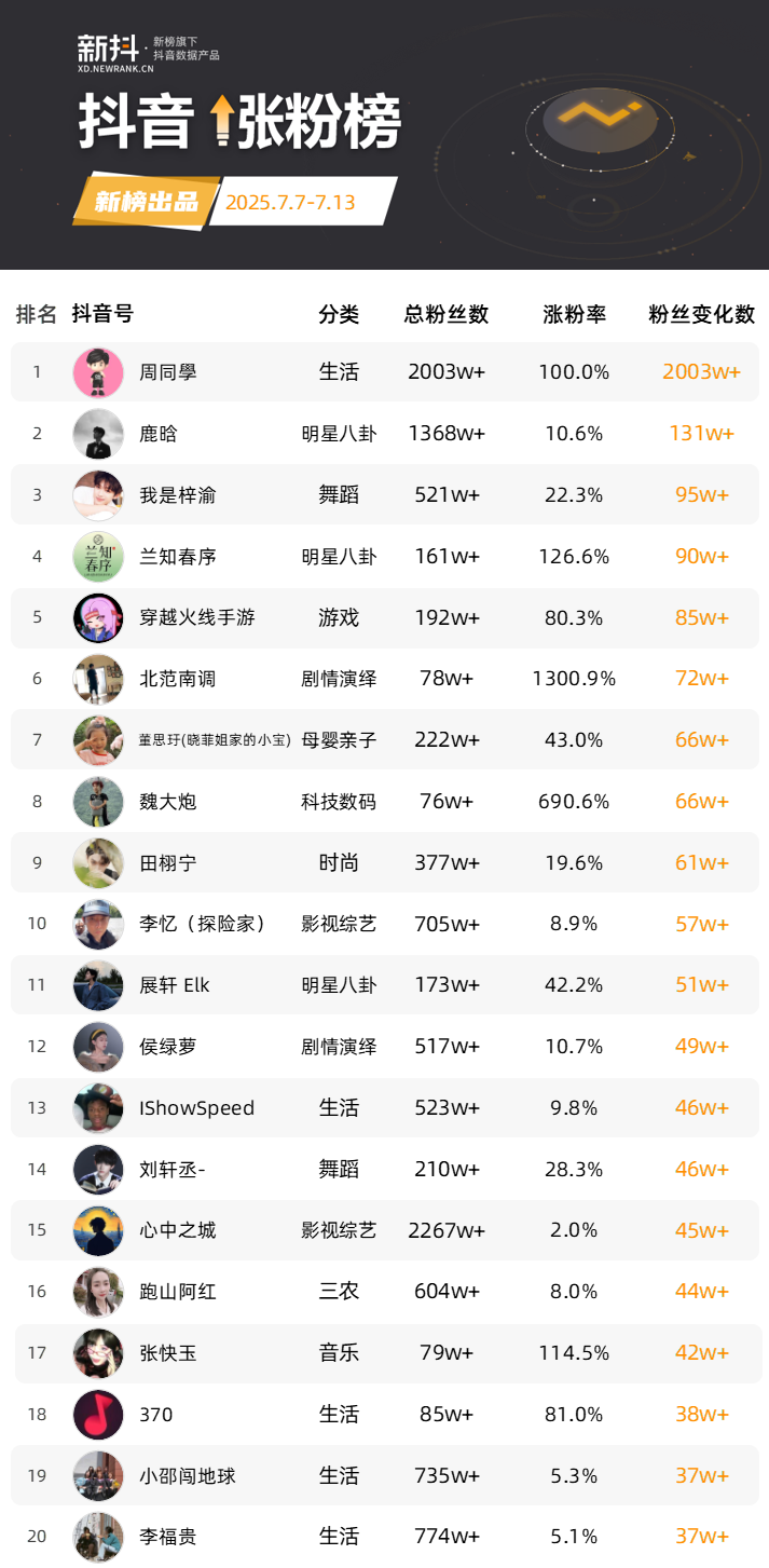 依托新榜旗下抖音数据工具“新抖”,新榜推出「抖音涨粉榜」,每周一期。本次统计周期为2025年7月7日到2025年7月13日。