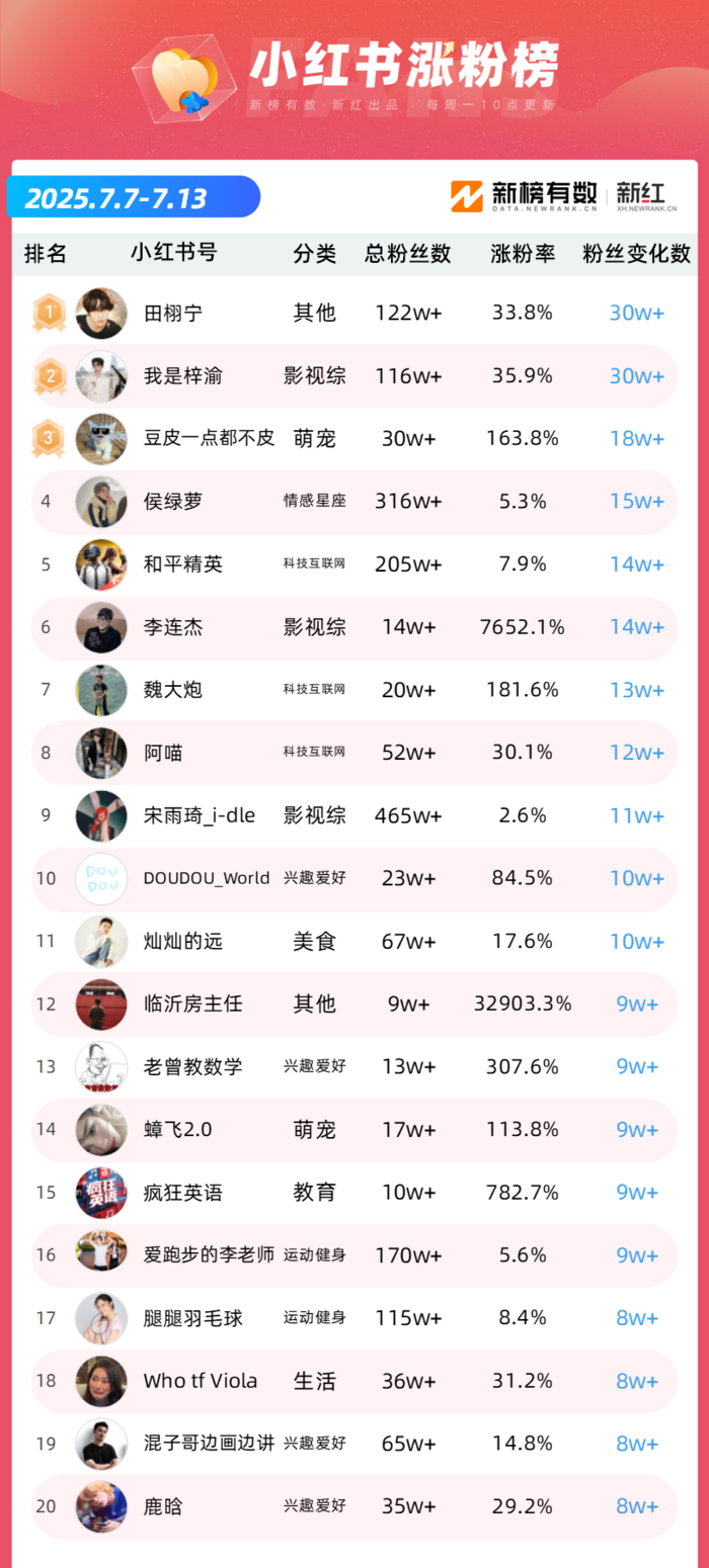依托新榜旗下小红书数据工具“新红”,新榜推出「小红书涨粉榜」,本次统计周期为2025年7月7日到2025年7月13日。