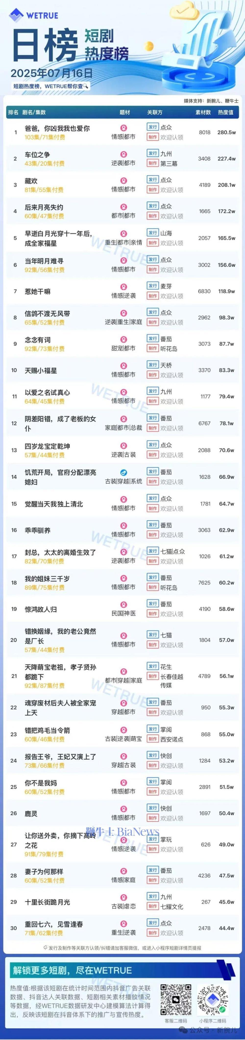 1、本日榜为WETRUE短剧数据公司提供,新腕儿和鞭牛士提供联合支持。