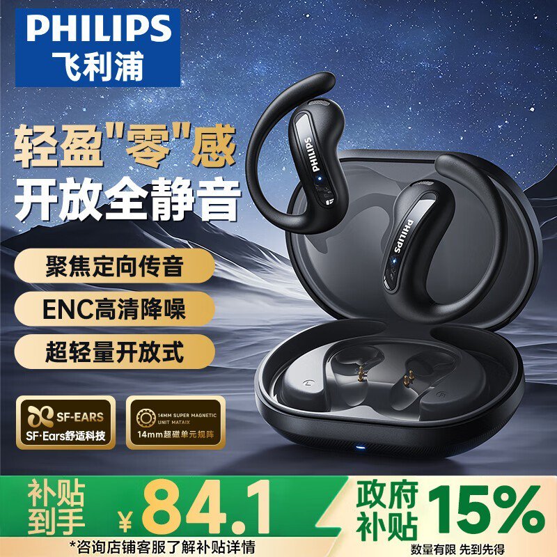 飞利浦挂耳式骨传导蓝牙耳机京东优惠价84.15元