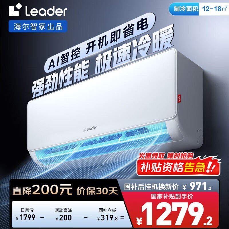 海尔智家大1匹空调挂机限时特惠价1216元