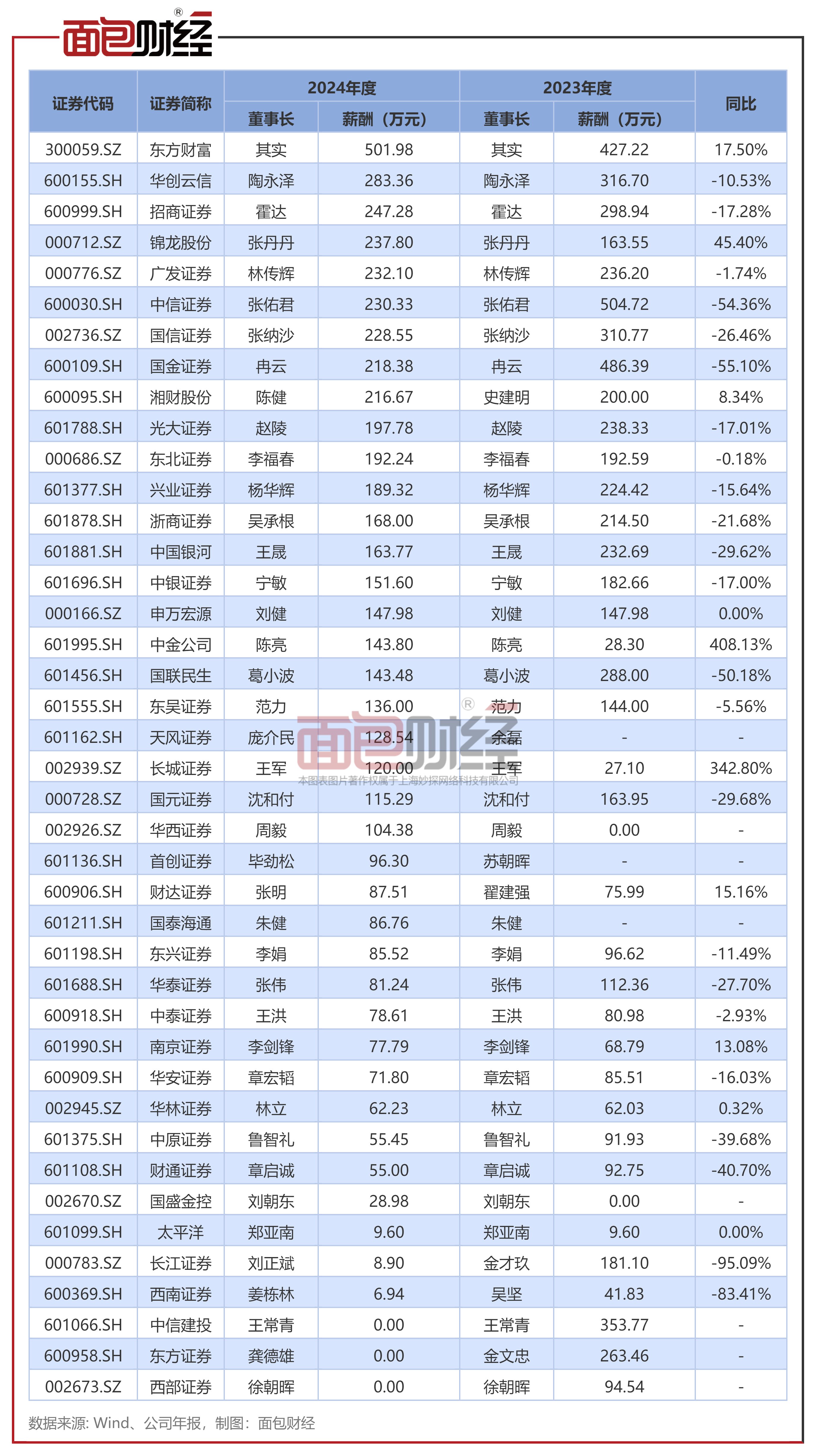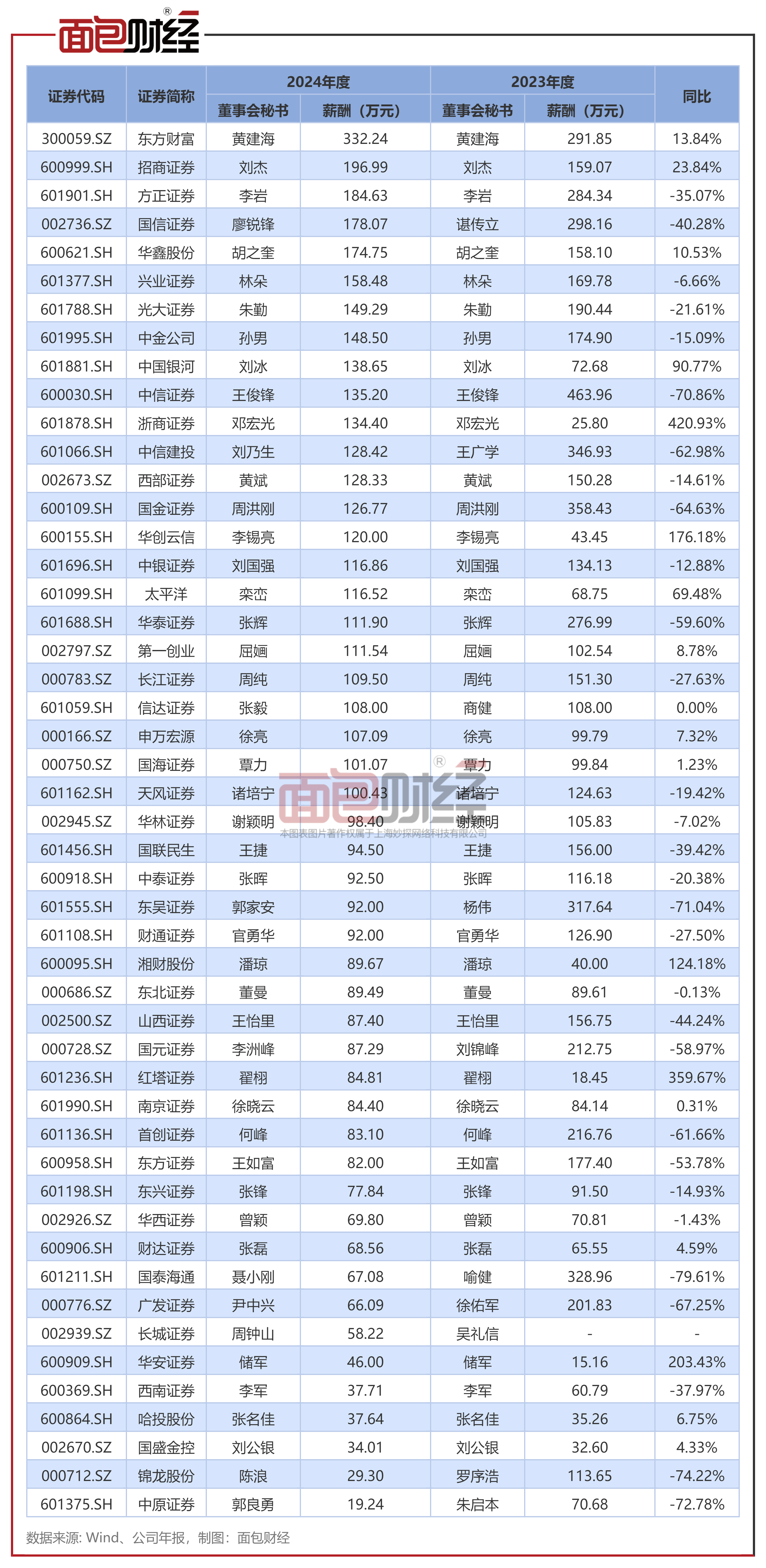 其中,中金公司陈亮、长城证券王军的薪酬同比上涨超过300%,主要系两位董事长均在23年年末上任所致。2024年,锦龙股份张丹丹的薪酬为237.8万元,同比上升45.4%,东方财富其实、财达证券张明、南京证券李剑锋的薪酬同比张超10%。