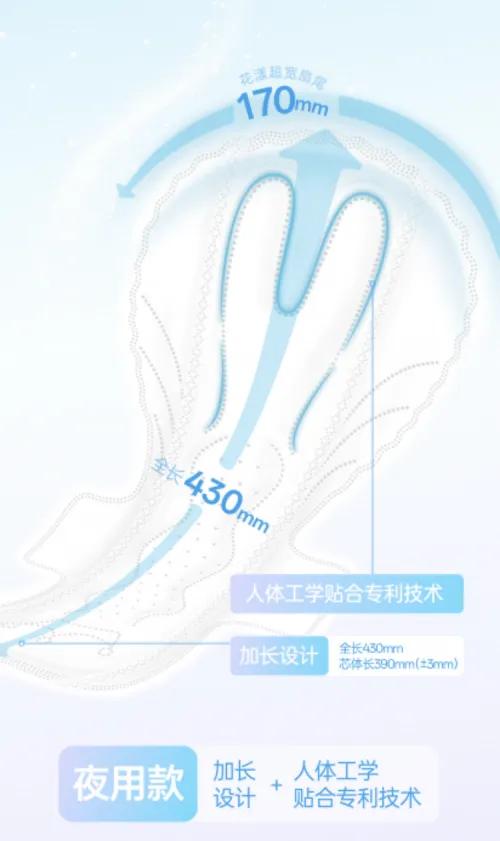 夜用430mm款卫生巾,则采用加长设计。针对消费者对“长度虚标”的担忧,东方甄选明确标注,夜用款全长430mm,芯体长度约为390mm,尾部宽度170mm。同时,夜用款也采用人体工学相关专利技术,尾部结构根据人体曲线优化,减少侧漏风险。