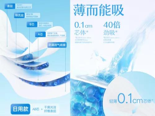 液体下渗后,日用及加长日用(250mm、290mm)卫生巾,使用轻薄的“AB芯体”快速吸收。根据第三方检测数据,0.1cm的芯体,吸收量大于自重的40倍。在结构上,AB芯的中心部分微凸,从而增强卫生巾与人体的贴合度,避免液体渗漏。