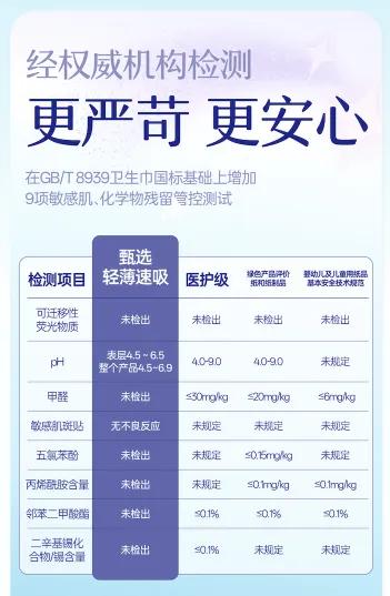 根据公开介绍,该卫生巾产品,达到《GB/T 35613-2024 绿色产品评价 纸和纸制品》中绿色标杆产品的品质要求,并参照《GB 43631-2023 婴幼儿及儿童用纸品基本安全技术规范》,满足婴儿纸尿裤的安全标准。