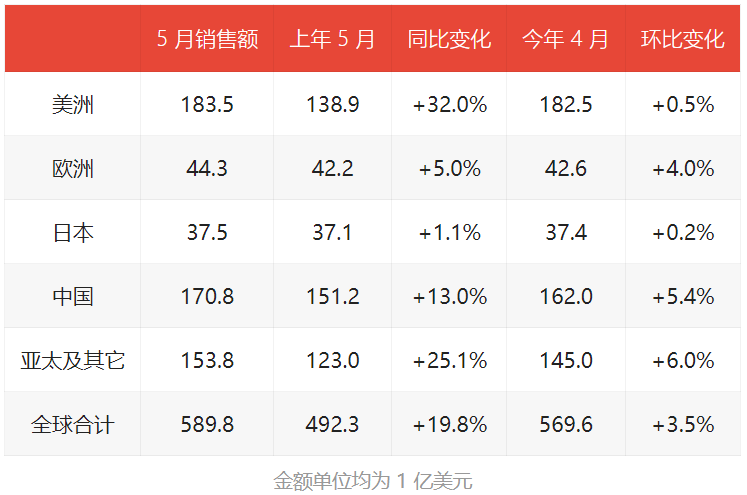 整体上来看,全球各区域市场都实现了相较去年同期和上个月的增长,同比增长由美洲、亚太及其它、中国引领,环比则是亚太及其它、中国和欧洲实现了较高增幅。
