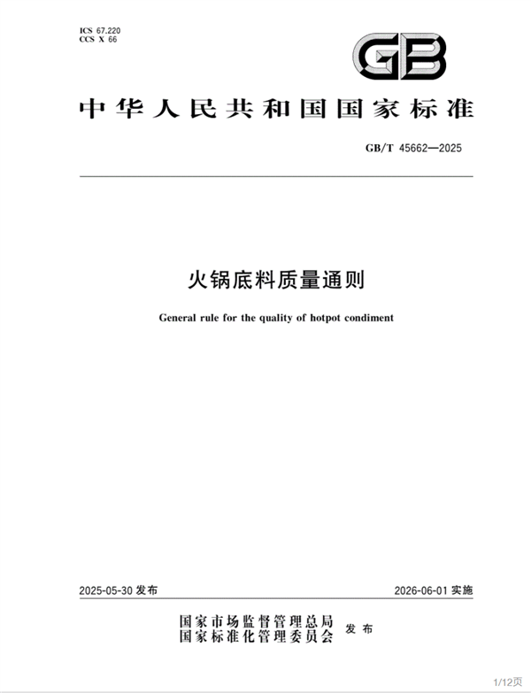 其中,GB/T 45662-2025《火锅底料质量通则》(以下简称“通则”)成功获批,并将于2026年6月1日起正式实施,填补了火锅底料领域国家标准的空白。