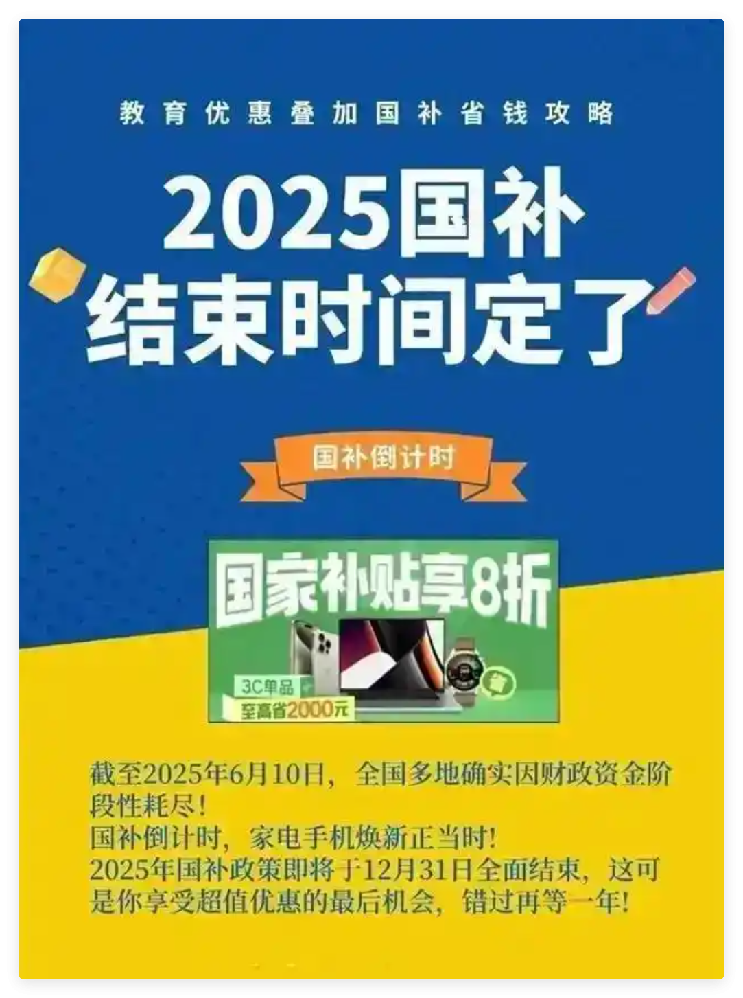 --- ### 03 全国重启时刻表(这些地方已开放!) **• 重庆(7月1日0点重启)** 新增饮水机、智能马桶等6类家电,每日10点/晚8点京东搜“家电599”抢券,建议线下核销 **• 江苏(6月底重启)** 严控跨省套利!维持“每日10点秒杀”机制,拼手速时刻到 **• 广东(线下持续开放)** 认准“粤焕新”通道,叠加地方券综合省30%,优先选择政府合作门店 **• 湖北(6月中旬最早重启)** 新增空气净化器、智能手环,即领即用无需抢券 **• 预警地区** 河南空调、湖南新能源车库存告急,建议7月优先下单 --- ### 04 避坑指南:3大陷阱让补贴秒失效 **陷阱1:发票雷区** 抬头必须为**个人姓名**并注明“型号+SN码”!郑州王先生因发票未填SN码,500元补贴审核失败 **陷阱2:先涨后补套路** 警惕商家“先涨3000再打折”!用京东“价格走势”查30天历史价,确认是否为真优惠 **陷阱3:代办诈骗** 官方无任何代办通道!近期出现冒充客服“代领国补”骗局,需通过京东、云闪付等正规平台操作 --- ### 05 末班车警报:12月31日截止≠安全 **• 高消耗品类预警** 空调预计8月前消耗60%额度,新能源车10月起审核积压 **• 地方额度危机** 河南空调、湖南新能源车补贴池见底在即 **• 汽车生死线** 最晚10月前提交报废材料,否则赶不上末班车 > **血泪教训**:武汉李先生去年拖到11月申请汽车补贴,因审核积压错过2万元补贴