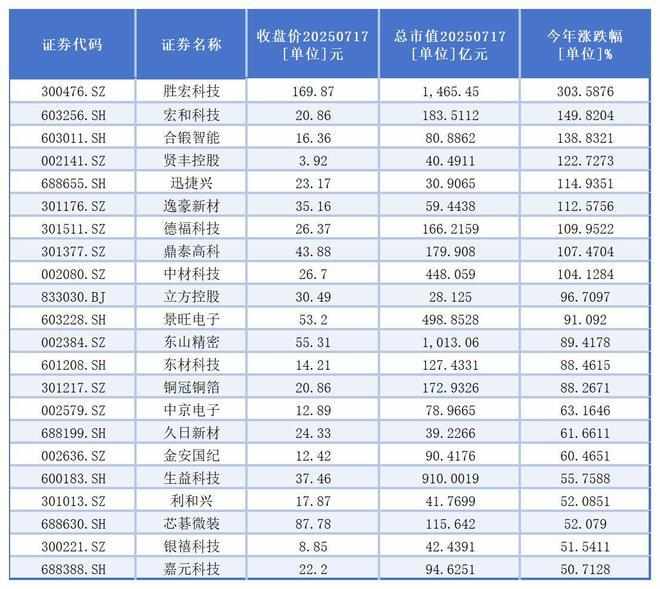 从二级市场表现看,截至7月17日收盘,今年以来,共有120家上市公司股价实现上涨,其中,9家涨幅超过100%,胜宏科技(300476.SZ)以303.59%的涨幅位居第一。