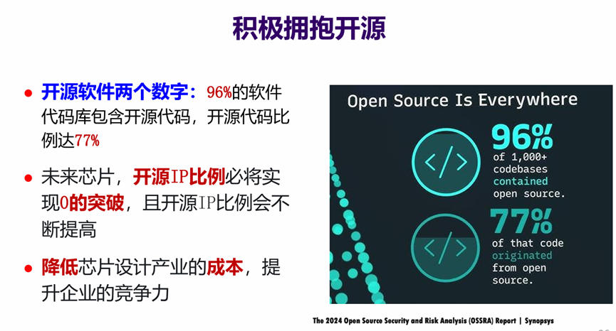 开源可以结构性的帮助降低成本,在开源软件当中96%的软件代码库包含原代码,开源代码比例77%。未来芯片开源IP比例比将实现0的突破,且这个比例会不断提升,这个提升就会帮助整个产业降低成本,从而提升企业竞争力。