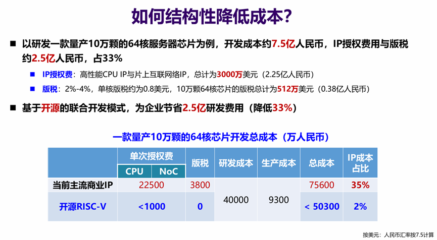 接下来我围绕其中一点看看我们的实践——如何结构性的降低成本?我的思路是开源,因为这个已经有成功案例了这里以研发一款量产10万颗64核服务器芯片为例,保守估计开发成本约7.5亿,IP授权费用与版税约2.5亿,占33%的成本。基于开源的联合开发模式可以为企业节省2.5亿研发费用,可以让企业把这些钱用在其他领域,做更好的创新解决方案。这些就是RISC-V带给我们的新机会。