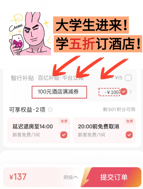 • 满减券:订单金额满足一定条件即可使用,如满500元减100元,常用于日常预订或节假日活动期间。
