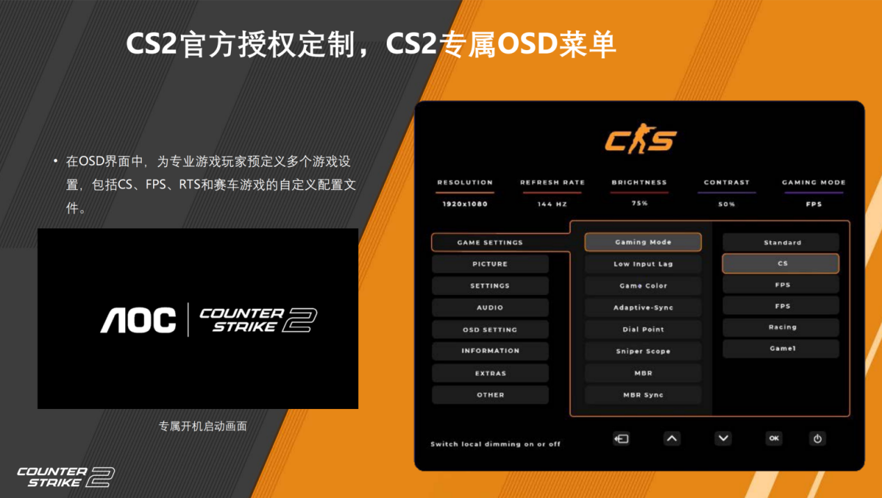 内置与Valve联合调校的CS游戏模式,针对游戏特性对显示参数进行精度优化,实现从色彩呈现到动态响应速度的精准适配。不仅如此,它还搭载了CS官方授权的专属OSD菜单系统,玩家一键即可切换至职业级竞技状态,彻底告别繁琐的手动调试流程。
