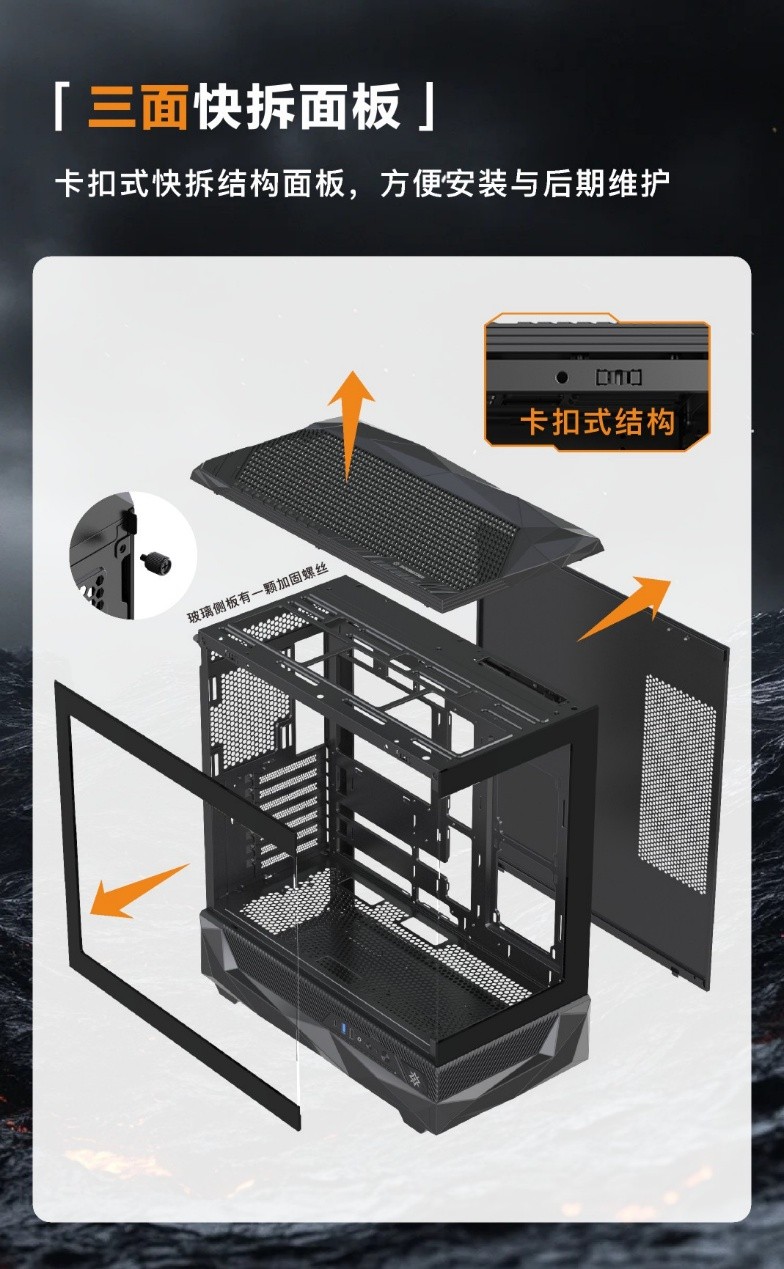「黑曜石」机箱在设计上采用了三面快拆设计,不论装机还是日常清灰维护时,可实现轻松拆装,新手装机OR老手升级,都完美地告别“螺丝刀困扰”,让玩家真正掌控硬件安装过程,体验纯粹的装机乐趣。