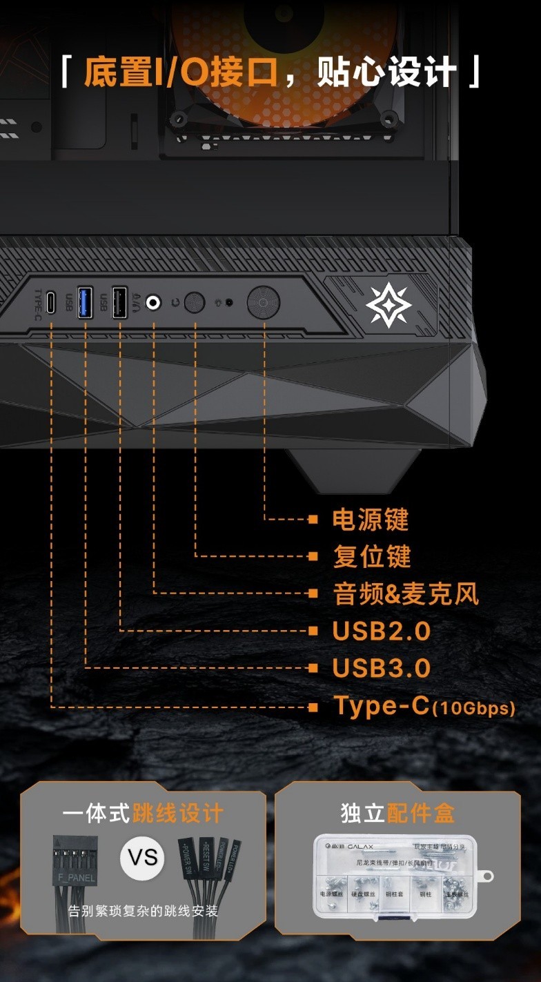 在配置上,机箱IO更是毫不吝啬地使用了10Gbps的Type-C高速接口,而且底置的电源键、USB、音频接口也方便桌面使用的玩家;同时配备了一体式跳线与独立配件盒,装机省心又轻松