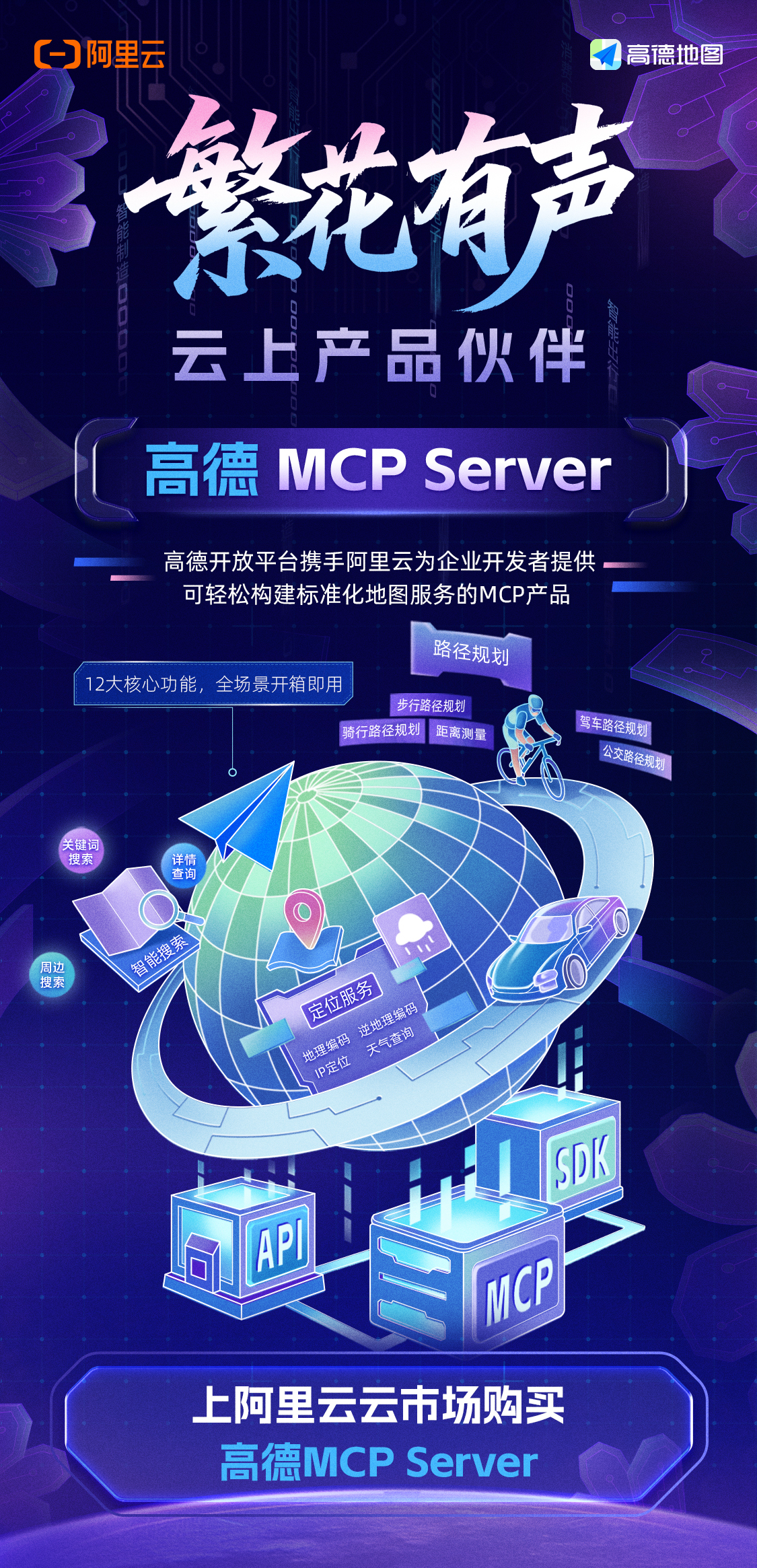 作为阿里云AI生态伙伴计划-"繁花计划"首批标杆伙伴,高德开放平台携手阿里云,面向企业开发者推出地图服务产品MCP Server ,通过技术能力与生态资源的深度协同,助力开发者高效构建标准化地图服务,加速智能化场景落地。