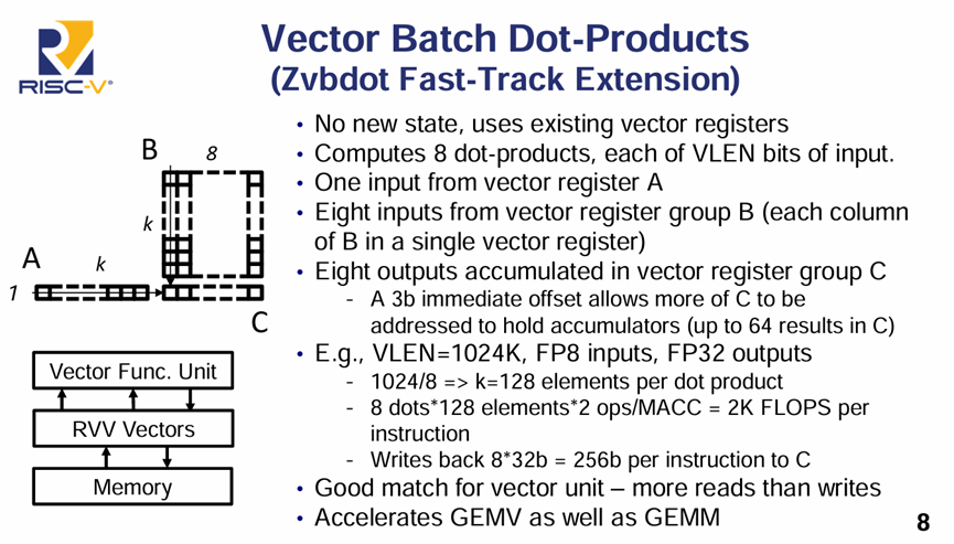 向量中的矩阵:没有额外的矩阵状态,对于较长的矢量长度、允许比点积更大的吞吐量。