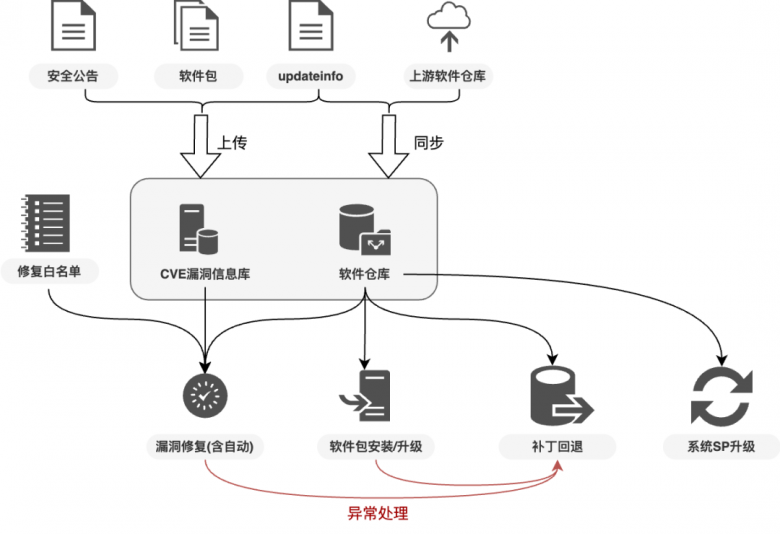 • 混合云同步服务能力:适配不同网络环境,提供离线环境与官方仓库同步、互联网区域官方源代理、隔离区内容安全检查及内网区补丁分发修复等服务能力。