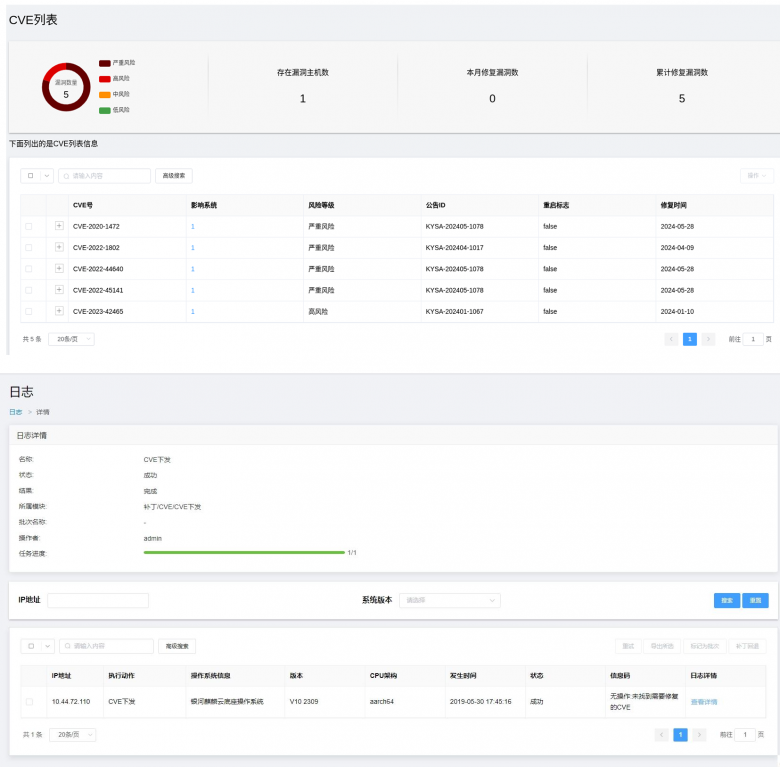 • 补丁生命周期管理:依托麒麟软件官方仓库保障补丁质量,支持自定义仓库配置,自动同步安全公告,按CVE维度透明化管理关联软件包,明确漏洞修复路径。