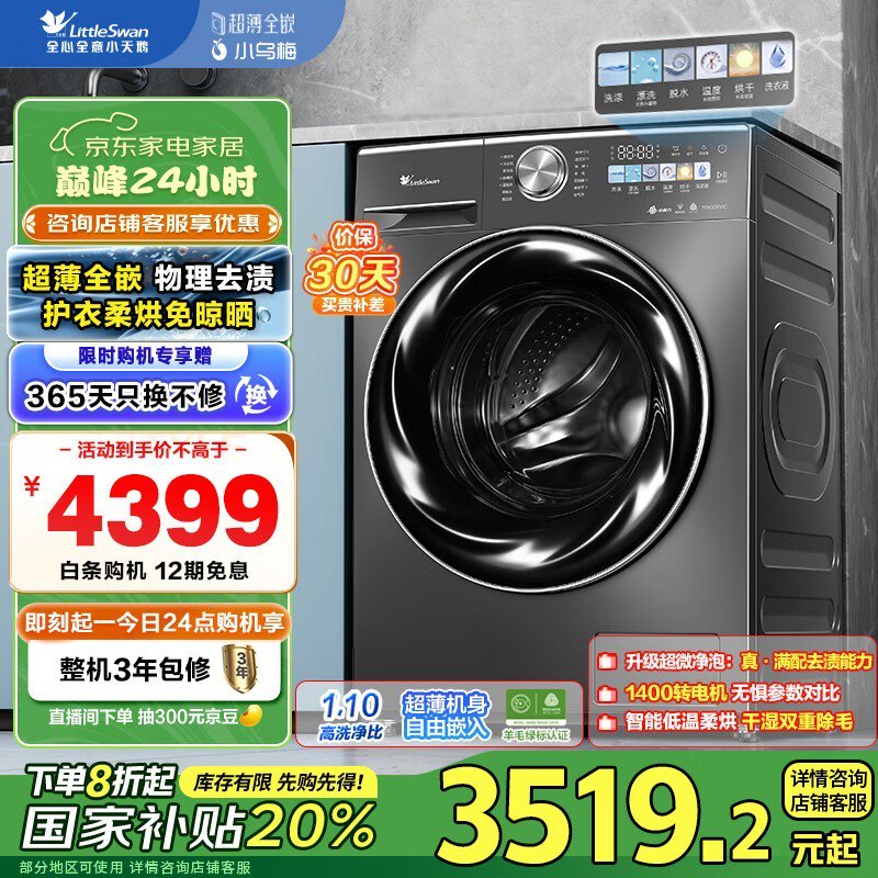 小天鹅小乌梅纤彩洗烘一体机京东促销价4319元